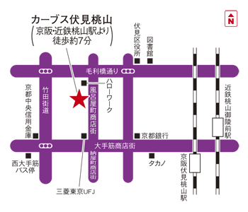 京阪伏見桃山駅または近鉄桃山御陵前駅から徒歩10分。ハローワーク伏見の2件南隣り