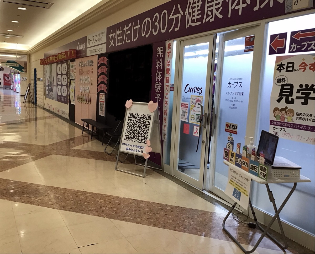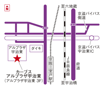 京阪宇治線三室戸駅か徒歩10分。アルプラザ宇治東正面入口からエスカレーターで3階に上がり、左折してまっすぐ。asu-bestさんのお向いにあります。