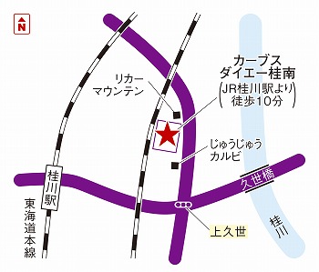 171号線から桂川街道の間にあるダイエー桂南店の1階 JR桂川駅から徒歩14分 最寄りのバス停》北上久世・久世橋西詰 自動車・バイク・自転車の方は大型駐車場・駐輪場(無料)をご利用下さいませ。 -