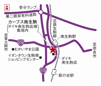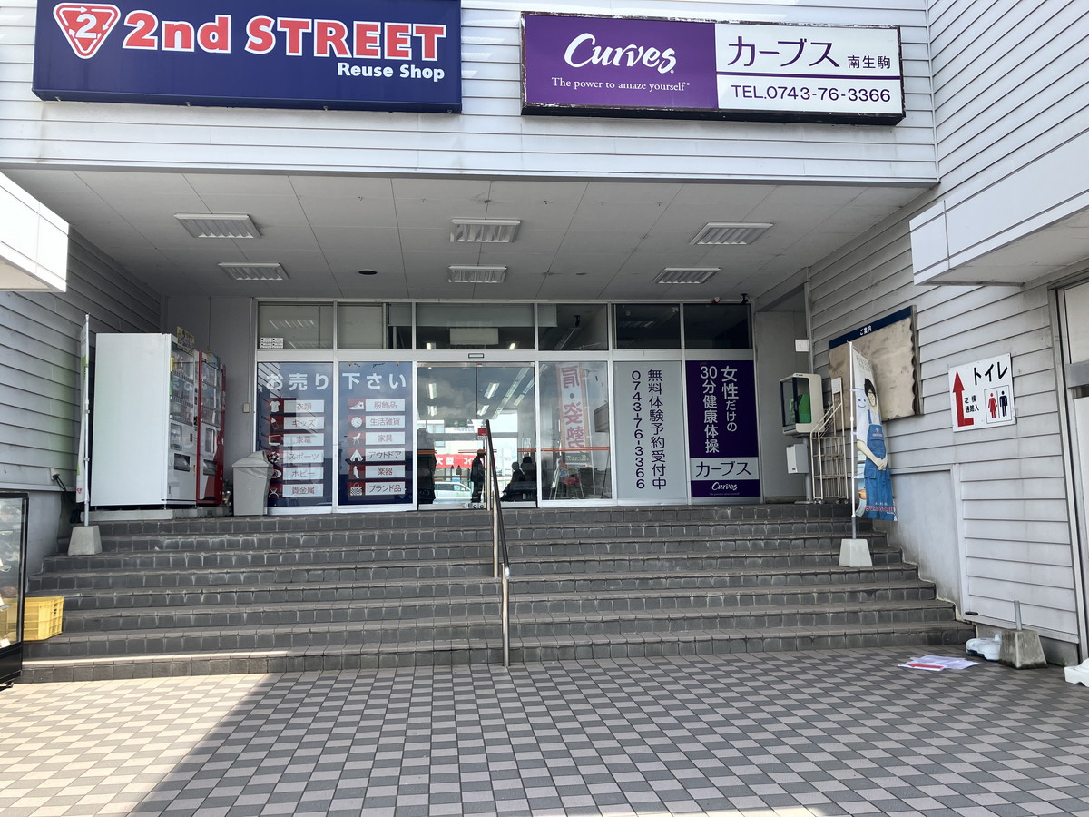近鉄南生駒駅より徒歩5分。改札出て左出口、王寺方面へ直進し、橋を渡って更に王寺方向へ直進。1つ目の角を右に曲がり直進した左手。セカンドストーリーさんの向かいがカーブス南生駒です。