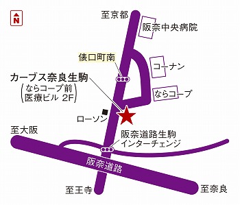 近鉄生駒駅から徒歩20分です。バスの利用で10分。阪奈道路生駒インターチェンジ付近。ローソンさんの向かい側、メディカルビルの2階にあります。駐車場もあるのでお車でもお越しになれます。 -