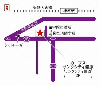 サンクシティショッピングセンター正面入り口からエスカレーターで2階、降りて左へまっすぐ