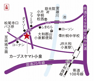 JR小泉西口からまっすぐ1本道です。近くには、コーナン、ダイソーがあり、お買い物ついでに運動ができます! -