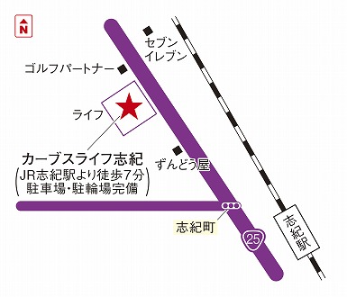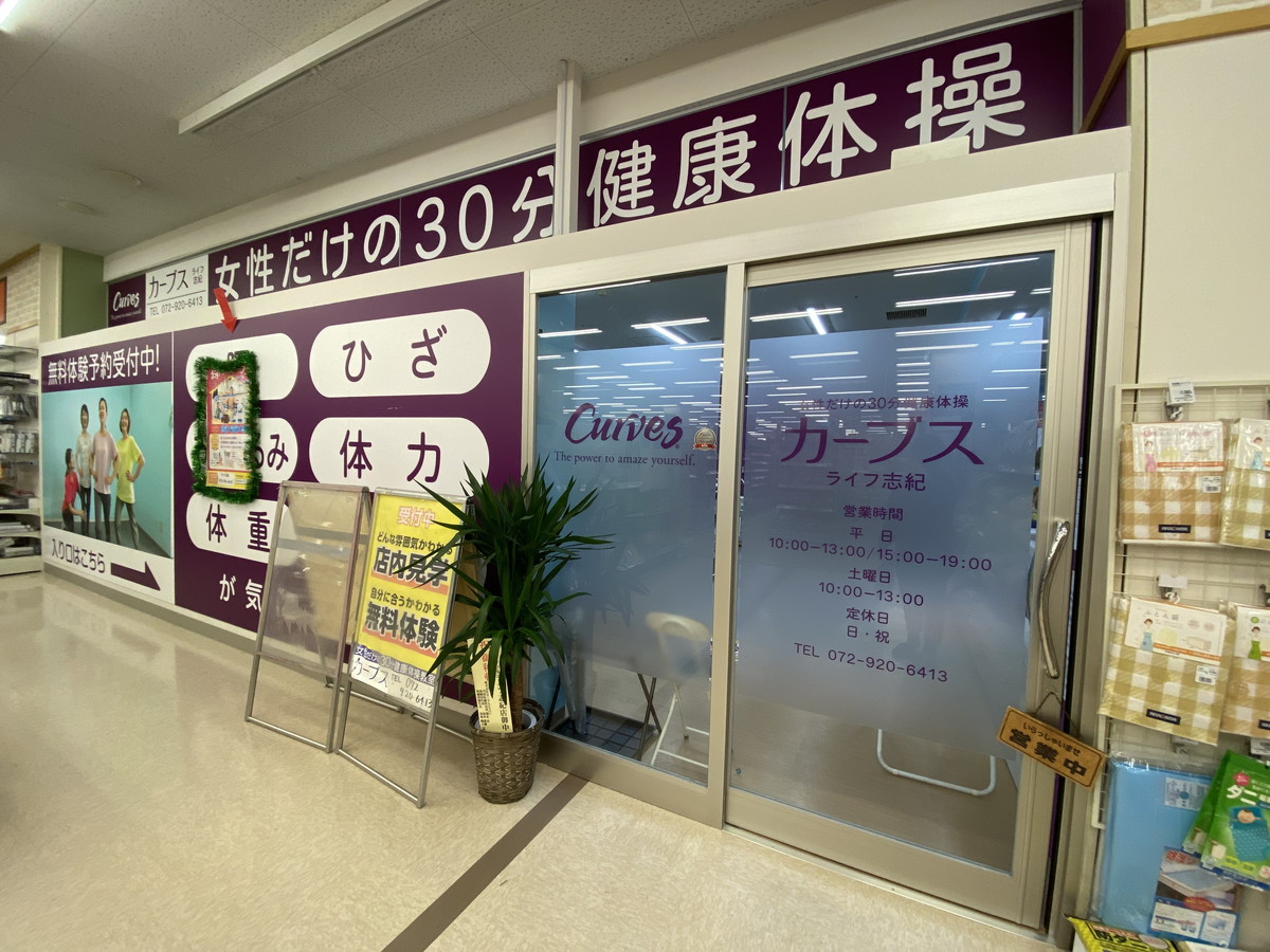 JR志紀駅改札を出て左に進み信号をこえ右折し直進 ライフ志紀店正面入口からエスカレーターで2階に行き左折 直進したつきあたりです。