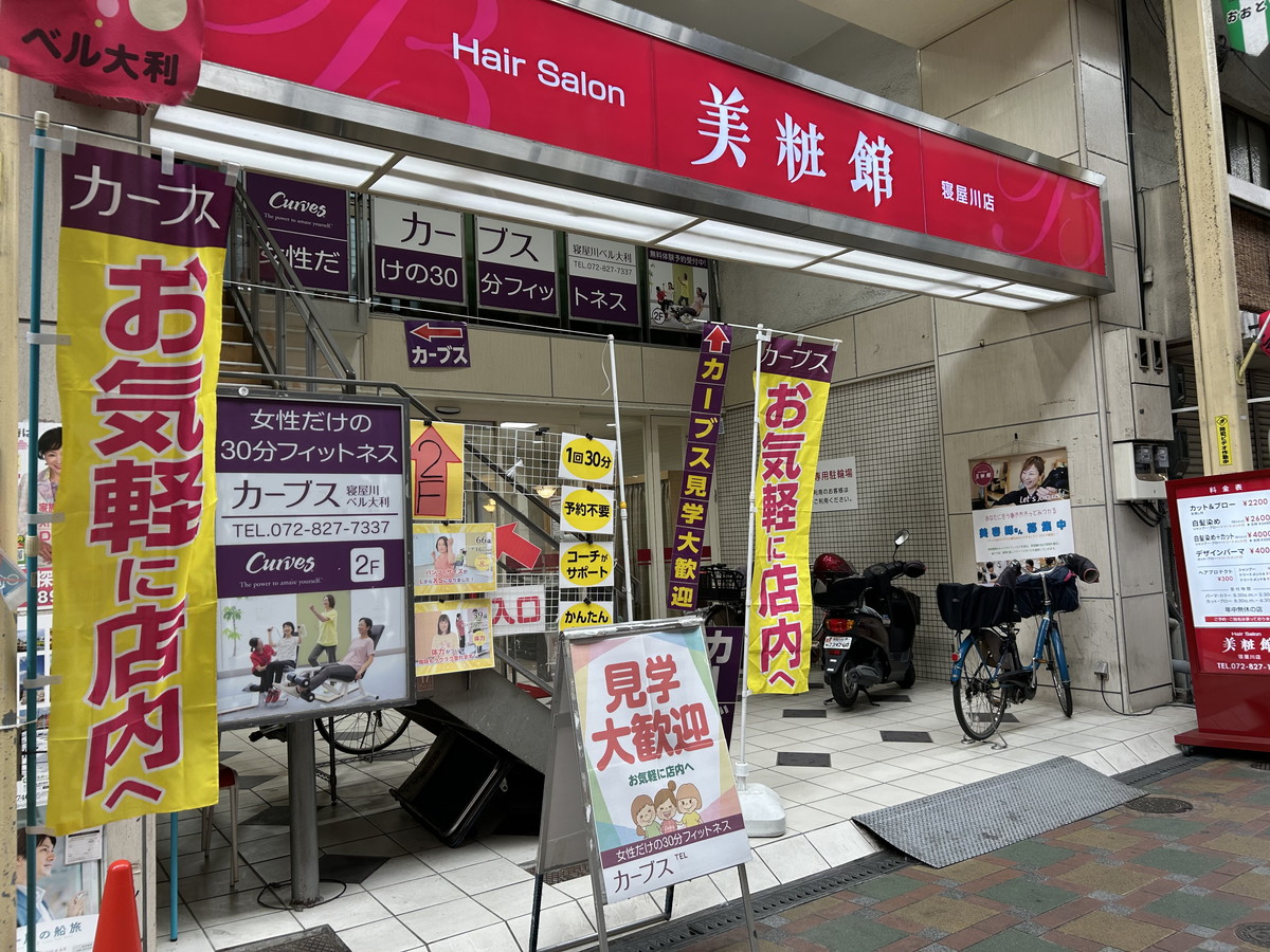 外島橋を渡りベル大利商店街を200M直進すると右手に美粧館さん(美容室)があり、美粧館さんの2階がカーブス寝屋川ベル大利店です。