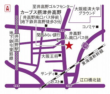 地下鉄 今里筋線 井高野駅1番出入口より徒歩約3分。大阪シティバス 井高野南口バス停下車すぐ。