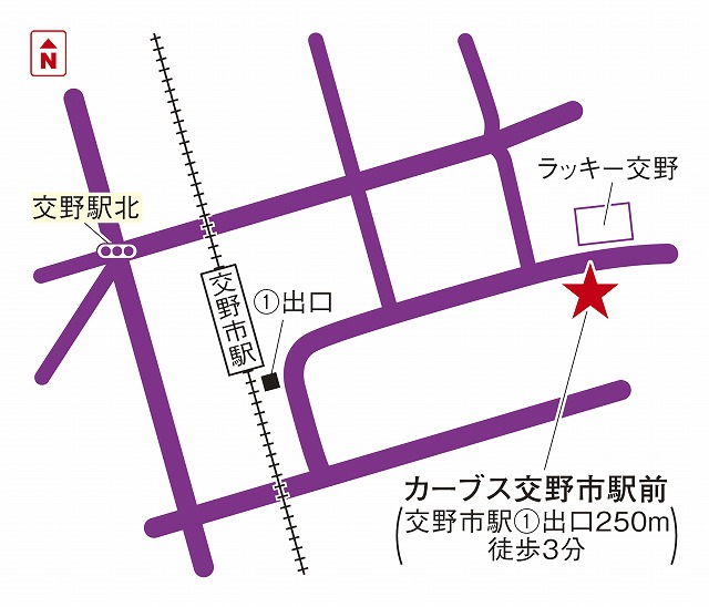 スーパーラッキー交野店さん向かいのビルの2階がカーブス交野市駅前店です