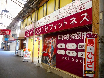 大阪メトロ御堂筋線昭和町駅3番出口を出て、ファミリーマートさんを左に曲がります。100m程直進した一つ目信号を吉野家さん側に渡ります。40m程直進し、広岡精肉店さんの前がカーブスです。