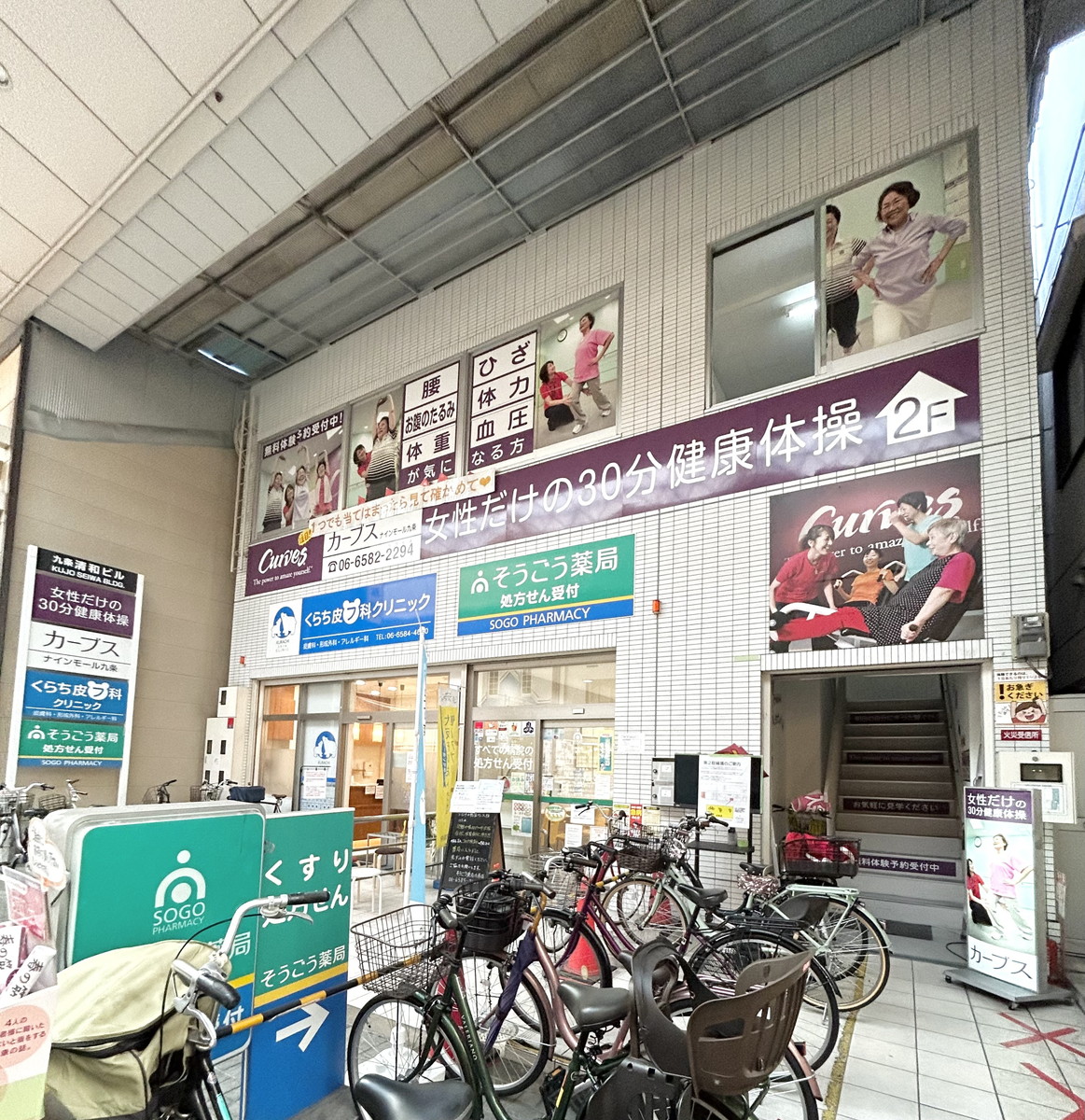 大阪メトロ中央線「九条駅」改札を出て右へ直進し、階段を下りてさらに直進します。マクドナルドさんの前を左に曲がり、ナインモール九条商店街へ入ります。商店街を直進し、右手に見える藤田外科胃腸科さんのお隣の2階が、「カーブスナインモール九条」です。