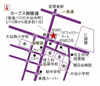 南海高野線「堺東」駅東出口より徒歩20分/南海バス「大仙中町」停留所すぐ/府道197号線、御陵通交差点すぐファミリーマートさんとアオキさんの間の階段を上がった2階にあります。