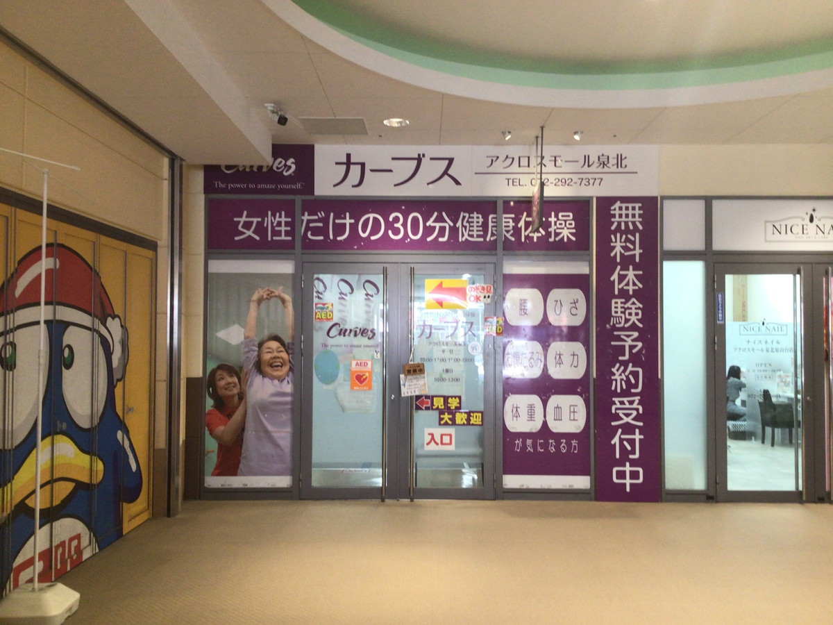栂・美木多駅からアクロスモール泉北さん行きの無料シャトルバスに乗って頂くと、約6分でアクロスモール泉北さんに到着致します。1階TOHOシネマさん沿いに進んでいただくと、カーブスアクロスモール泉北店がございます。