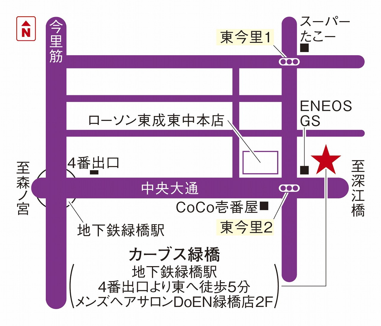 中央大通り沿いを東(深江橋方面)へ直進しガソリンスタンド、エネオスさんの隣です。美容院、男髪さんの上、2階です。