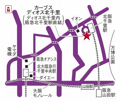 阪急千里線北千里駅から徒歩2分。北千里駅出口を左へ直進し、ロータリー前のエスカレーターで2階へ。東進衛星予備校さんの隣。