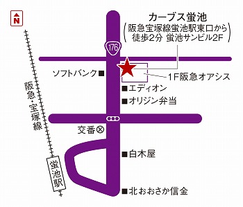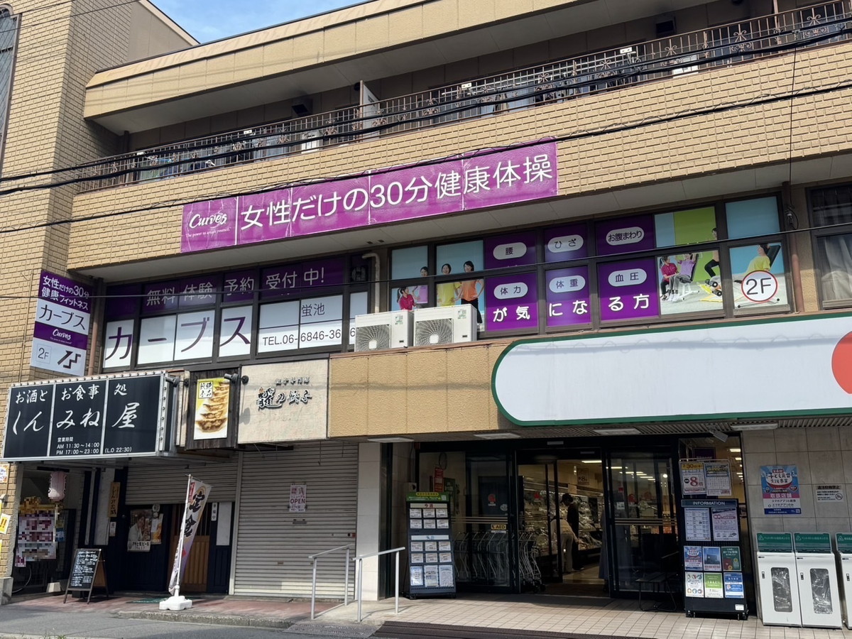 阪急蛍池駅東口から徒歩3分。蛍池交番を背に信号を渡りすぐ左折。そのまま直進し、阪急オアシスさんを通り過ぎた茶色い外観の蛍池サンビル2階がカーブスです。