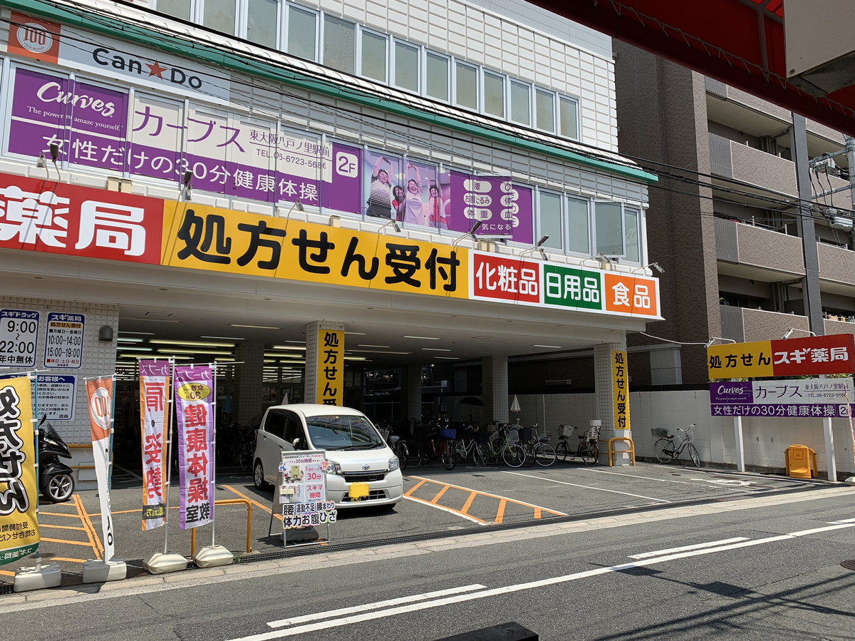 まっすぐ進み八戸ノ里小学校を過ぎると左手にスギ薬局さん2階がカーブス八戸ノ里駅前です。