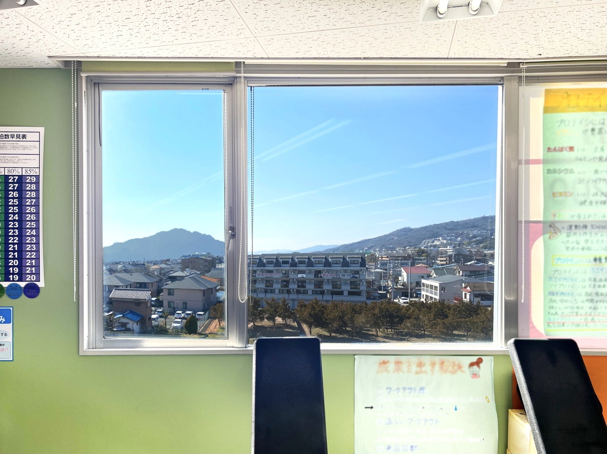 店内からは六甲山が綺麗に見える景色を一望できます。夕陽が沈む時間はまた格別です。開放的な空間で運動ができ、皆さん喜んでくださっています♪ -
