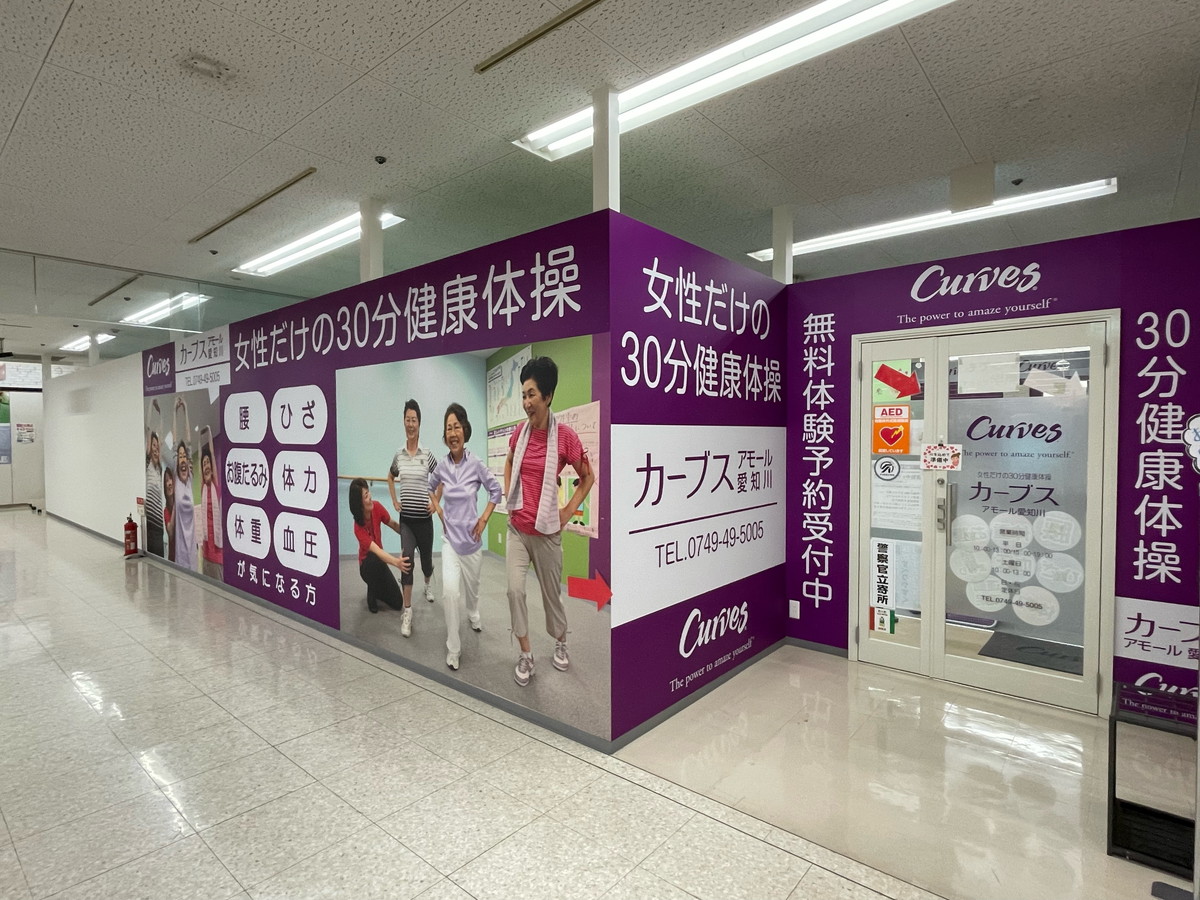 平和堂アモール愛知川の正面玄関から入って、エスカレーターを上がり右手前の奥にカーブスがあります!屋上駐車場からですとエスカレーター降りて左に進むとすぐに見えてまいります! -
