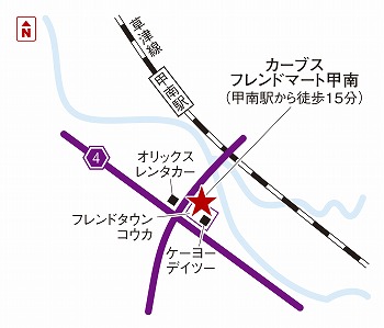 県道4号草津伊賀線 竜法師交差点すぐフレンドマート内。甲南駅から徒歩18分。