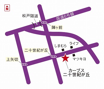 松戸駅東口、京成バス千葉ウエスト 4系統 三矢小台行きのバスに乗り、バス停「二十世紀ヶ丘」下車徒歩3分♪ 真向かいにしまむらさん、右にくら寿司さんがあります!