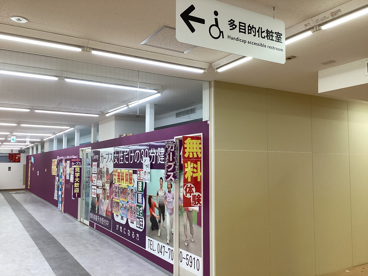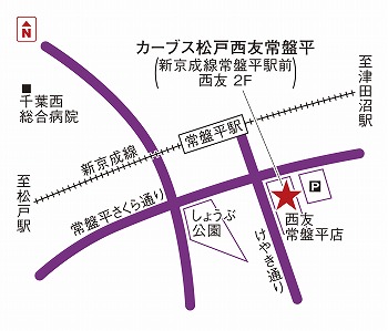 新京成線の常盤平駅南口を出て、ドトールコーヒーショップ前から横断歩道を渡ってセブン-イレブン前へ。けやき通りに沿って進むと西友常盤平店が見えます。2階へお上がりください