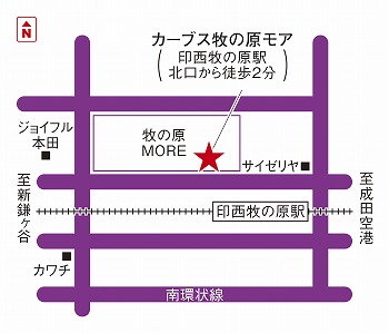 電車の方は印西牧の原駅を出て右に進み、印西牧の原郵便局を過ぎて徒歩5分です。お車の方は国道464号を成田方面に進み、ヤマダ電機さんの大きな看板を目印にいらしてください。インナーモール内わくわく広場さんの隣です。