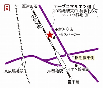 JR総武線 稲毛駅 東口 徒歩7分 マルエツ稲毛店正面入り口からエスカレーターで3階に行き、降りたらすぐ右折。美容室リズヘアーさんのお隣