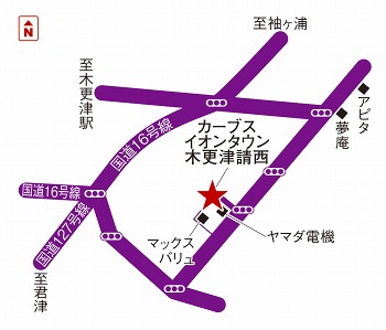 JR内房線 木更津駅東口より太田循環バスに乗車「イオンタウン木更津請西」下車。