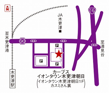 JR内房線 木更津駅西口から市内循環バスに乗車「イオンタウン木更津朝日」下車。