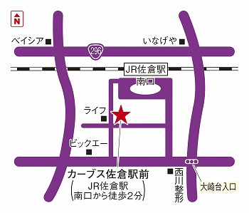 JR総武本線/成田線 佐倉駅南口を出て右へ直進し、セブンイレブンさんの角を左に曲がります。