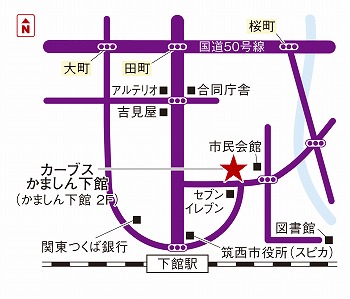 JR水戸線下館駅北口より徒歩5分。スーパーかましん下館店さん西側入口から階段またはエレベーターで2階へ