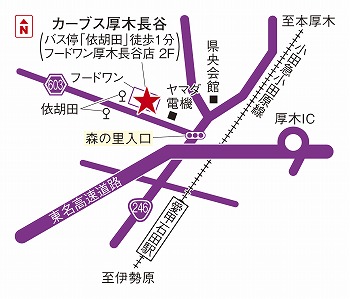 神奈中バス 依胡田バス停から徒歩2分、フードワン館内の2F、マクドナルドの反対側の奥にある紫色の看板が目印です!