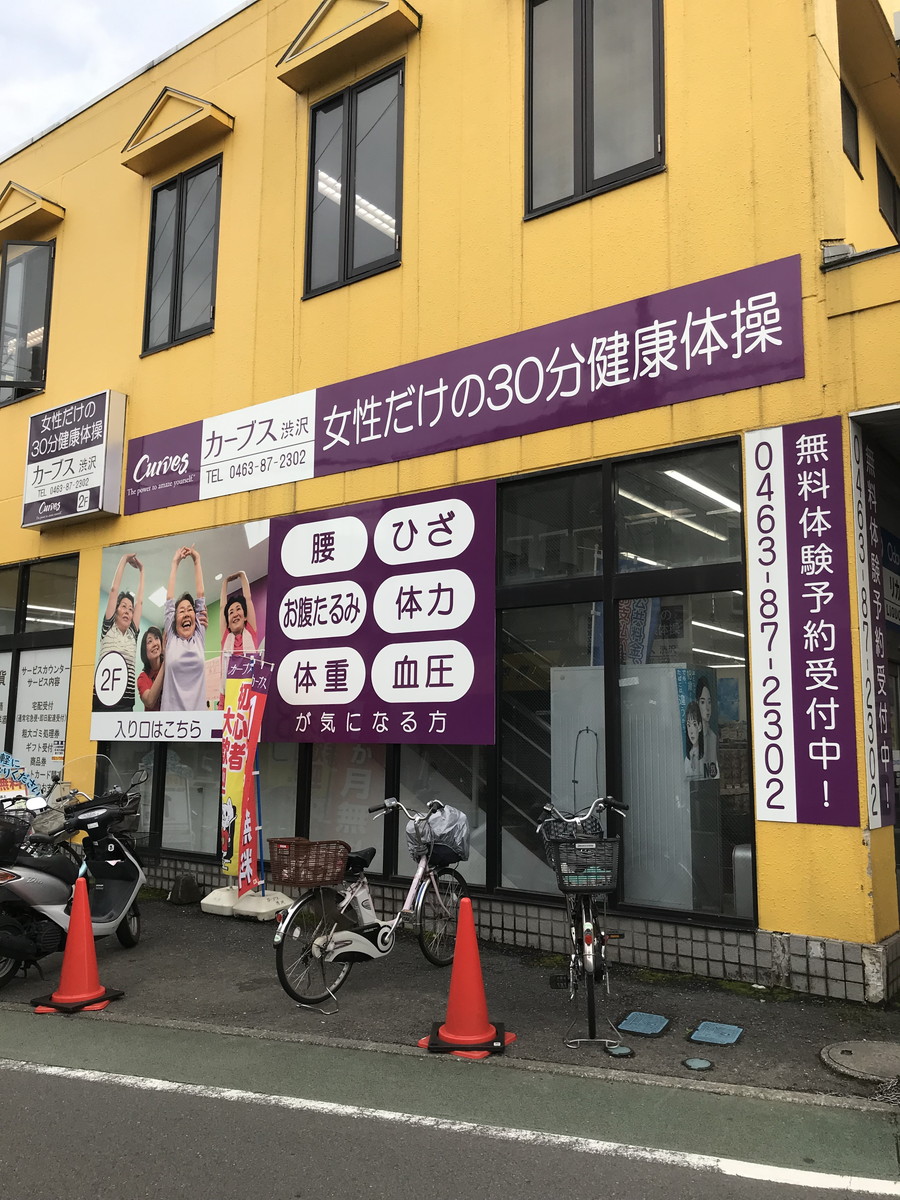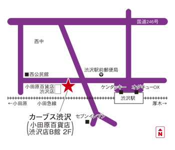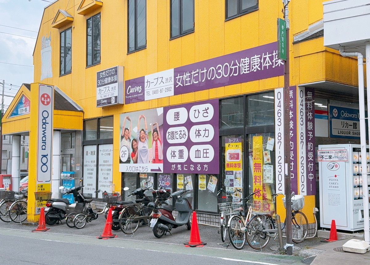小田急線渋沢駅北口を出て右側にある階段を下り、目利きの銀次さんの角を左折して直進します。少し歩くと黄色い建物の小田原百貨店渋沢店B館(リカー館)さんがあり、そちらの2階になります。駐車場、駐輪場完備!