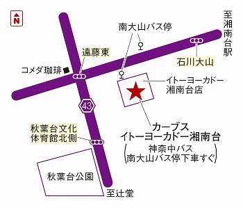湘南台駅西口から慶応大学行きのバスに乗り、「南大山」で下車。目の前のイトーヨーカドー内2階です。 -