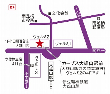 大雄山線大雄山駅の改札を出て正面のビル、ヴェルミ2の4階です。ヴェルミ内エレベーターで4階に進むと右手奥に入り口があります。車の方は市営駐車場をご利用下さい。2階渡り廊下を通ってヴェルミ2に入り、エレベーターで4階にお越し下さい。