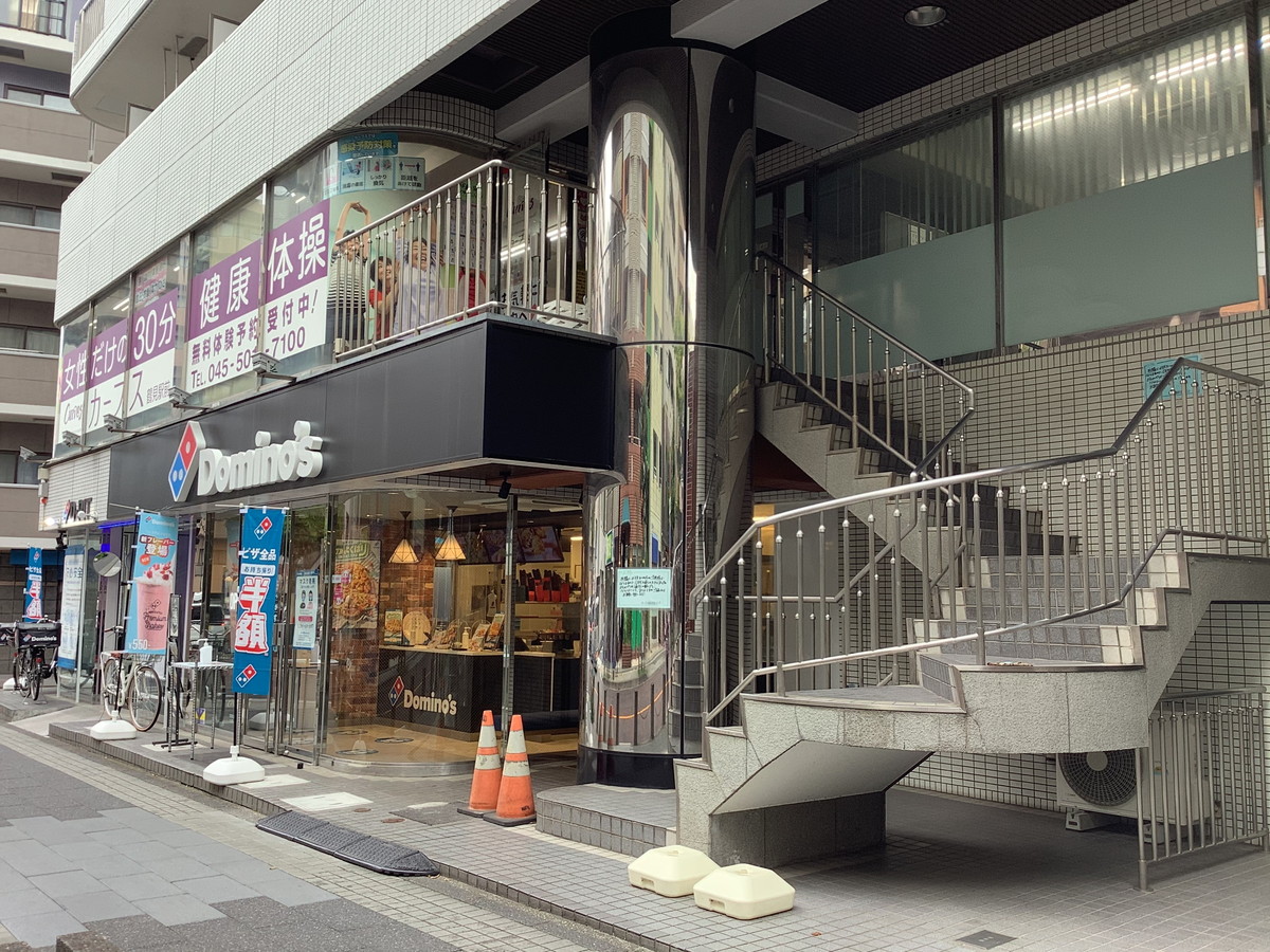 鶴見駅東口を出て、横浜銀行さんの前を左折。道なりに進むと、ドミノピザさんがあります。同じ建物の2階がカーブス鶴見駅前店です。