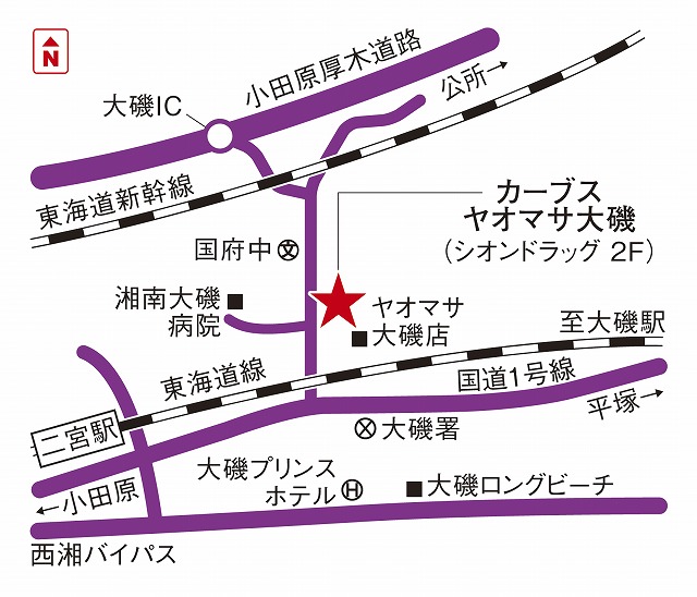 ヤオマサ大磯店さん隣 大磯かもめクリニックさんシオンドラックさん入口から見て左側外の階段上がってすぐカーブスヤオマサ大磯です。
