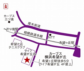 南口を降りて右に線路沿いを三ツ境方面へ進む。左手に見えてくるライフさんの4階(屋上駐車場)奥にカーブスがあります。