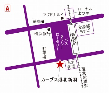 横浜市営地下鉄ブルーライン新羽駅出口1徒歩3分。横浜市営地下鉄ブルーライン新羽駅出口1を出て左に進み、交番を右に曲がり、突き当たりを左に曲がる。大きなたまか化成本社横浜工場さんの右にあるマンションの1階。