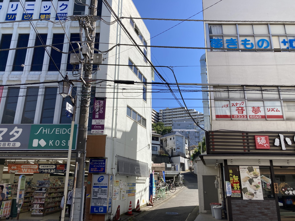 ラーメン屋さんとビルを挟む道を歩いて入り口へ★ -