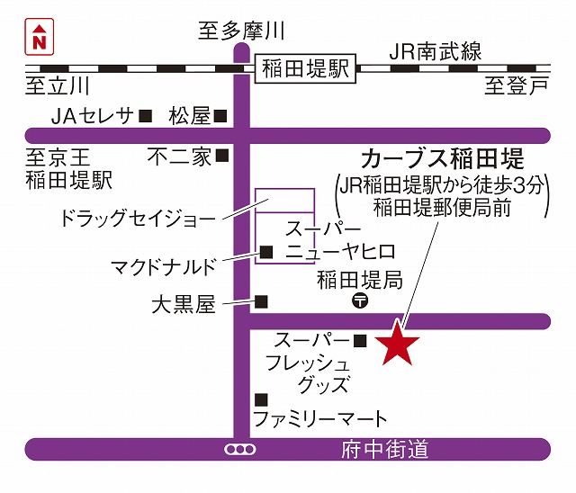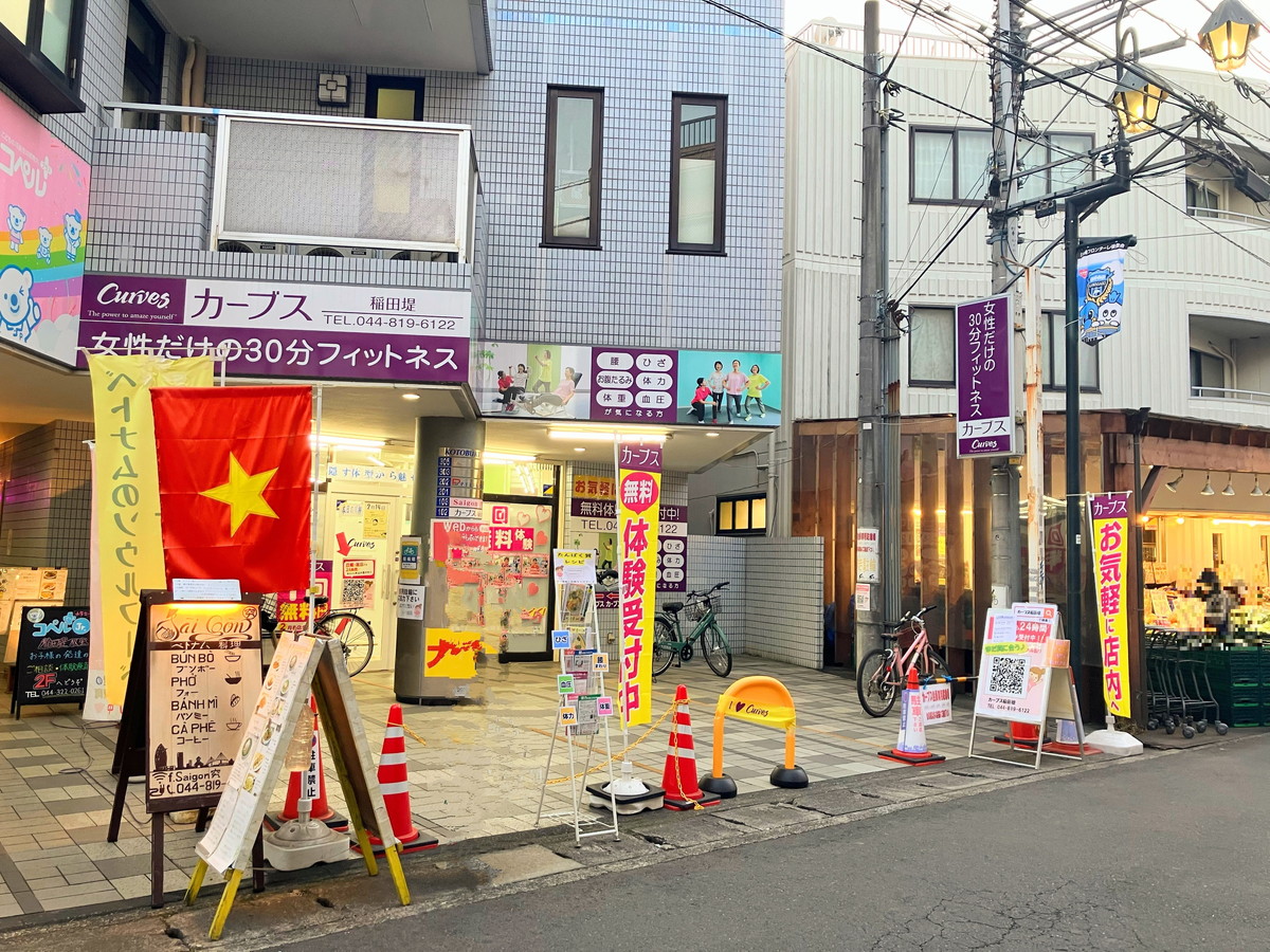 南武線稲田堤駅南口を出て左へ直進し、大黒屋さんの角を左に曲がります。左手に見える稲田堤郵便局さんの斜め向かい、スーパーフレッシュさんのお隣がカーブス稲田堤店です!
