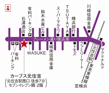 東急東横線、元住吉駅西口から左側徒歩7分。(ブレーメン商店街セブンイレブン隣)