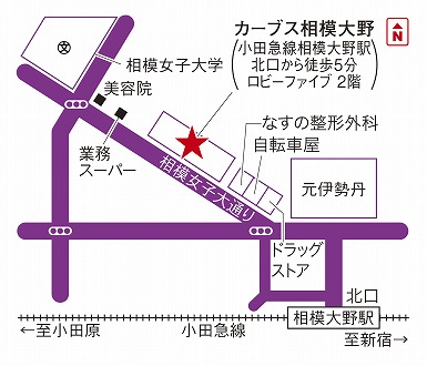 小田急線相模大野駅北口を出てコリドー通りに直進します。突き当りを左折し、ロビーシティ前交差点を右折、相模女子大通りへ。なすの整形外科の隣のロビーファイブビル、イルカ棟の2階がカーブスです。