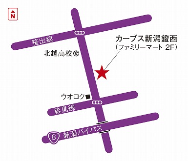 新潟北越高校さんから通り沿いに牛角さん方面へ進み、牛角米山店さんの隣のファミリーマートさん2階がカーブス新潟鐙西です。入口は建物裏側にあります。
