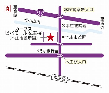 本庄駅北口から直進し、ハローワーク本庄さん手前の信号を左折。ビバモール本庄入り口正面エスカレーターで2階へ行き、サイゼリアさんの角を左折。りらくるさんの隣がカーブスです。