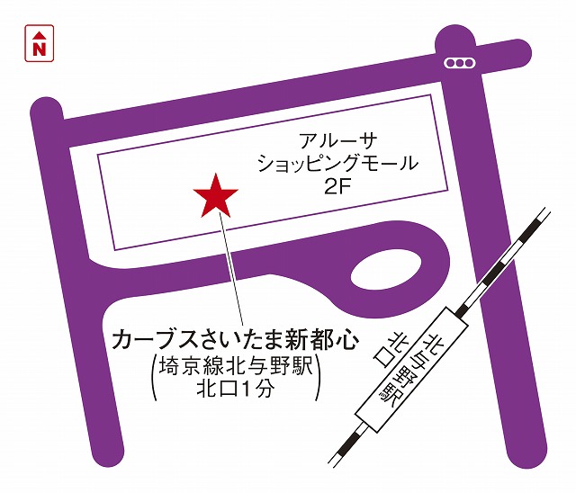 JR埼京線北与野駅北口より徒歩1分。アルーサショッピングモールには書店、ドラッグストア、スーパーが入っているので買い物にも便利です。 -