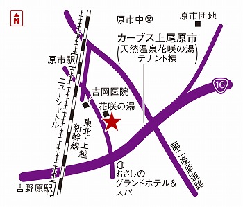 少し進むと右手にファミリーマートさんが見えますので斜め向い側が花咲の湯さんのテナント棟になり、花咲の湯さんの入口の向い側の美容室ドゥアイさんとラフィネデンタルクリニックさんの間がカーブス上尾原市店です