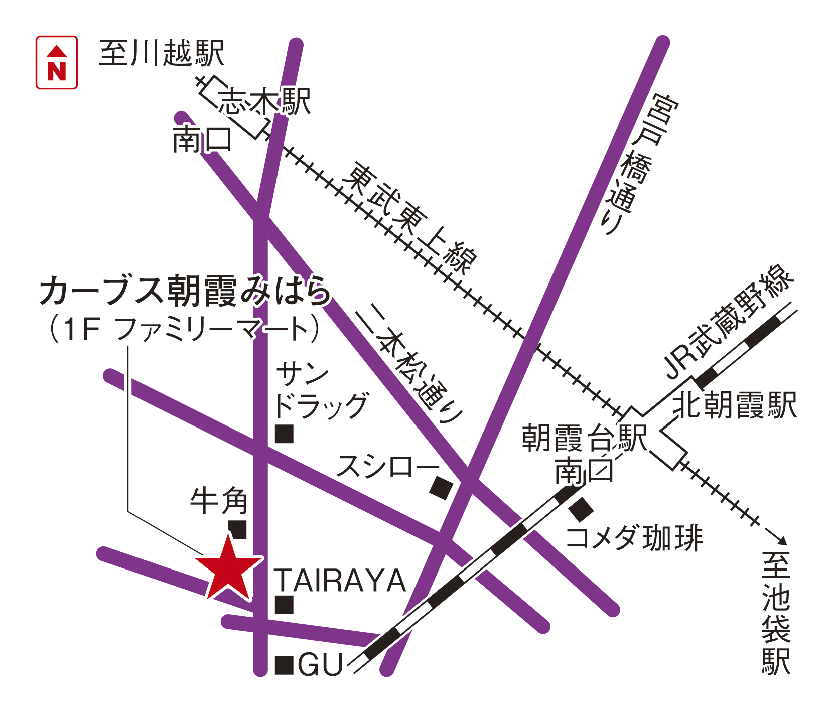 南口を出て線路沿いに朝霞第5小学校まで直進をし、歩道橋を渡ります。そのまま三原1丁目の信号まで直進するとスーパーのTAIRAYAさんが右手に見えます。そこを右に曲がり、左手に見えるファミリーマートさんの2階がカーブス朝霞みはら店です。