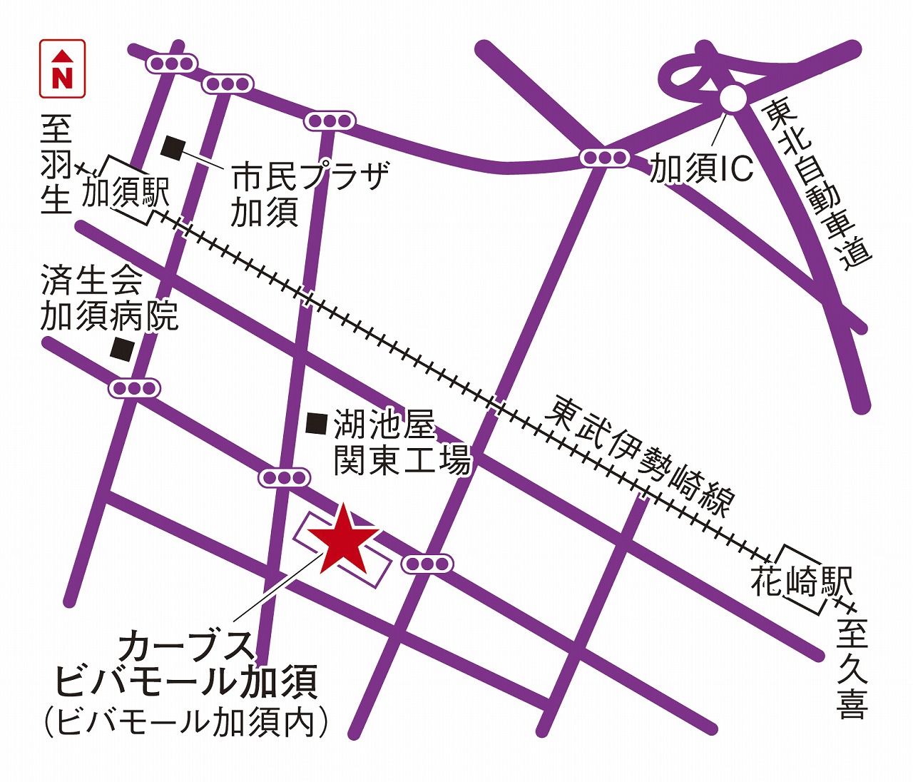 カーブスビバモール加須一番街1F(風の広場)タイヤ館さん裏側。快活CLUBさん横になります。加須駅から車で5分。花崎駅から車で10分。加須ICから車で7分。