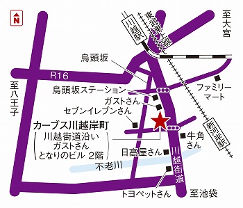 東武東上線川越駅より徒歩17分、新河岸駅より徒歩18分。川越街道沿い、丸源ラーメンさん隣のビル2階。
