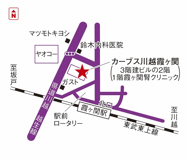 霞ヶ関駅より3分 → 東武東上線 霞ヶ関駅北口駅前ロータリーの向い駐車場突き当りビル徒歩3分